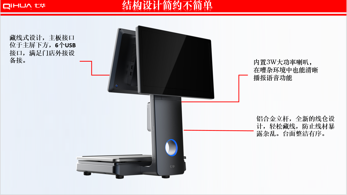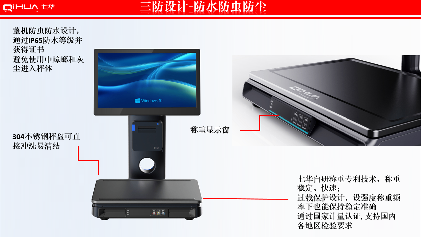 描述:新一代創(chuàng)新設(shè)計(jì),雙15.6英寸大屏,多點(diǎn)式電容觸摸屏可(0~50可調(diào)節(jié)角度)。鋁合金立桿,全新的線倉設(shè)計(jì),輕松藏線,防止線材暴露雜亂。臺(tái)面整潔有序。七華自研稱重專利技術(shù),稱重穩(wěn)定、快速;過載保護(hù)設(shè)計(jì),設(shè)強(qiáng)度稱重頻率下也能保持穩(wěn)定準(zhǔn)確;通過國(guó)家計(jì)量認(rèn)證, 支持國(guó)內(nèi)各地區(qū)檢驗(yàn)要求。外觀無死角設(shè)計(jì),方便日常維修清潔。 防水防蟲設(shè)計(jì),輕松應(yīng)該對(duì)農(nóng)貿(mào)市場(chǎng)等惡劣環(huán)境。